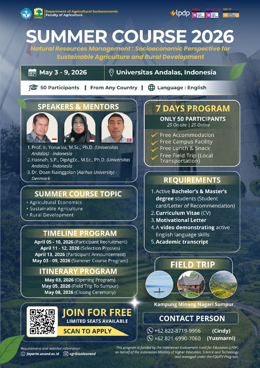 The Department of Agricultural Socioeconomics, Faculty of Agriculture, Universitas Andalas invites students to join the Summer Course 2026 with the theme: “Natural Resources Management: Socioeconomic Perspective for Sustainable Agriculture and Rural Development.”