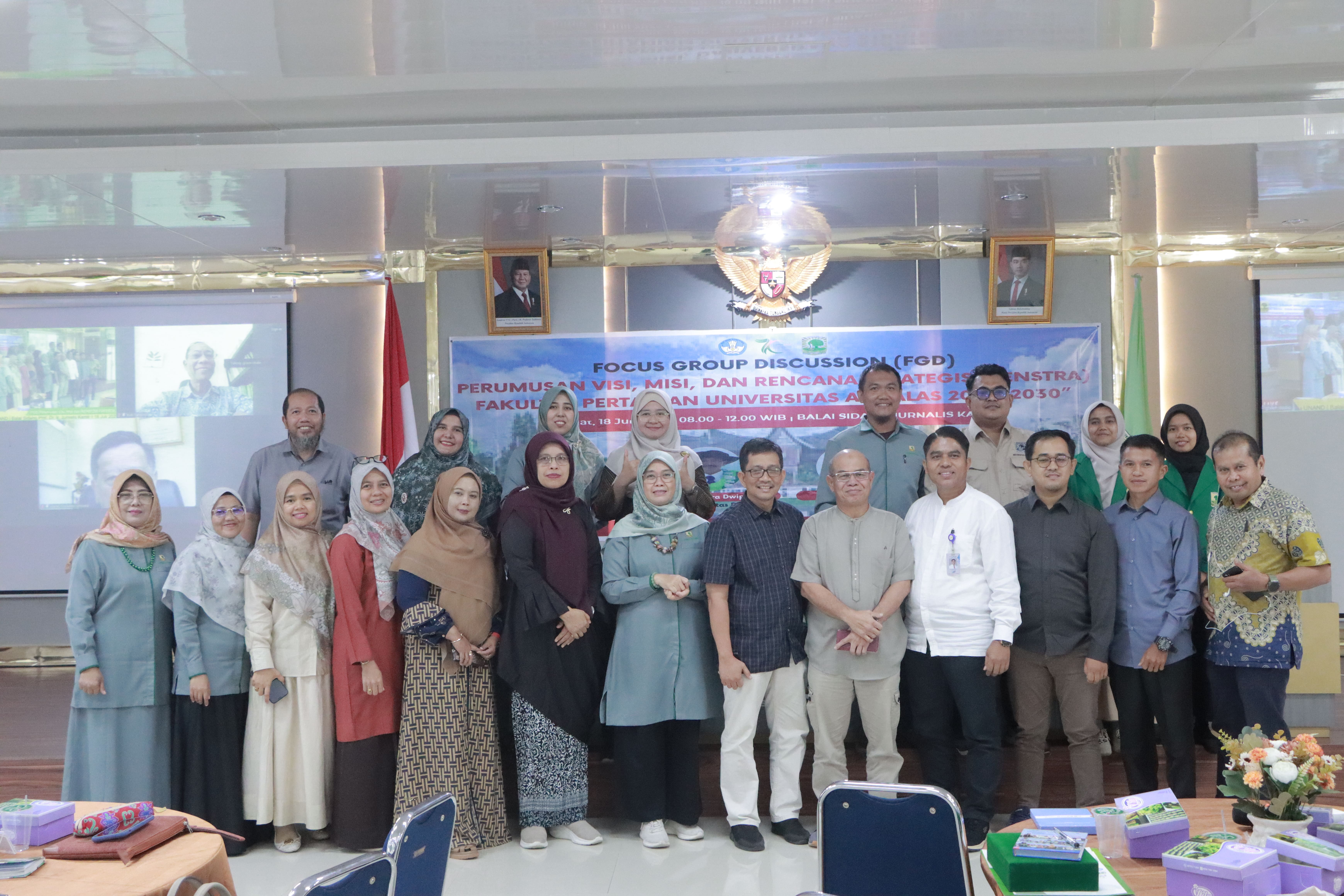 Padang, 18 Juli 2025 – Fakultas Pertanian Universitas Andalas menyelenggarakan kegiatan Focus Group Discussion (FGD) dalam rangka perumusan Visi, Misi, dan Rencana Strategis (Renstra) Fakultas Pertanian untuk periode 2025–2030. Kegiatan ini berlangsung pada hari Jumat, 18 Juli 2025 pukul 08.00–12.00 WIB, bertempat di Balai Sidang Prof. Dr. Ir. Jurnalis Kamil, M.Sc., Fakultas Pertanian Unand, dengan pelaksanaan secara hybrid (luring dan daring melalui Zoom Meeting) untuk mengakomodasi kehadiran stakeholder yang berhalangan hadir secara langsung.